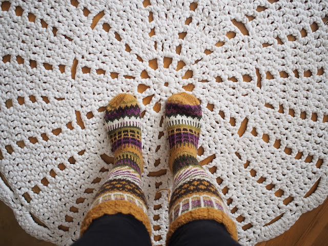 Lankana 7 veljestä ja malli Anelma Kervisen Anelmaiset, löytyy Ravelrystä. Kaikki kukkaset, kikkaset ja muut härpäkkeet jätin pois. Valmista tuli nopeasti kun lanka on paksua ja ohje mielenkiintoinen. Päättely oli työlästä, mutta ei ylivoimaista. Sukista tuli vähän reilun kokoiset mutta eipä niillä ole tarkoitus ulos lähteä joten ei haitanne käyttöä.